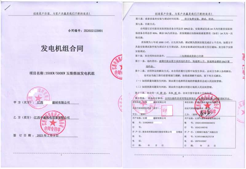 我公司与江西一建材有限公司通过双方恰谈后,成功签订一台350KW和两台500KW玉柴柴油发电机组采购合同,我公司会在合同规定的时间内将设备如期交付。该合同采用是广西玉柴柴油机做为动力,与全铜无刷的发电机组合而成。